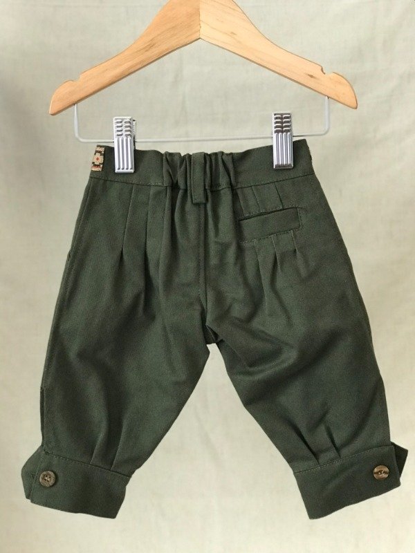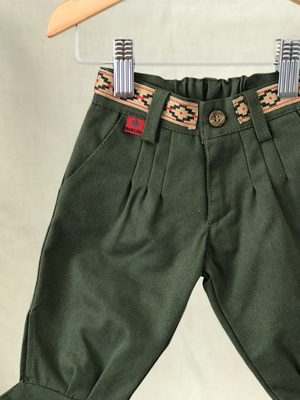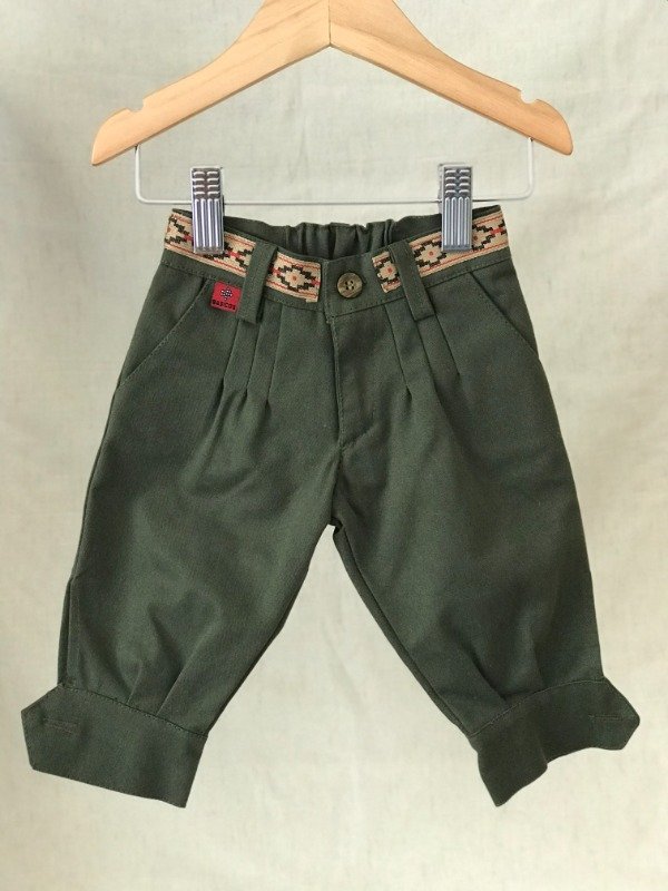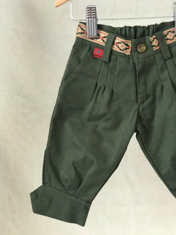 Bombacha de campo con guarda pampa en cintura, bolsillos laterales y bolsillo ojal trasero, cremallera con cierre, elástico en cintura media para mayor comodidad del bebé. Motivo de guarda pampa puede llegar a variar sutilmente según disponibilidad. Tela: Gabardina 100% algodón.